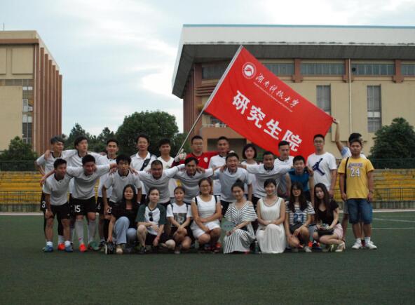 狭路相逢勇者胜,决赛现场人声攒动,场边观众的加油声也是此起彼伏。球场局势跌宕起伏,面对实力强大的潇湘学院,研究生队开场不久便意外丢球落后,但上半场结束前10分钟,队长汤俊顶住压力,抓住为数不多的两次进攻机会,通过犀利的运球、跑位、突破、射门将比分反超。下半场随着球队整体体能下降,我研究生球队的防线出了纰漏,给了对手一个点球机会,在比赛结束时比分持平。点球大战阶段,凭借着队友的出色发挥,研究生足球队最终以6:4赢得了比赛的最终胜利。